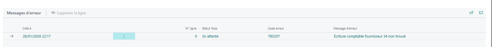 Lors du traitement de cet enregistrement, le système vérifie si une écriture comptable fournisseur liée à ce numéro de document Yooz existe avec la valeur En suspens définie dans les paramètres de l’organisation.